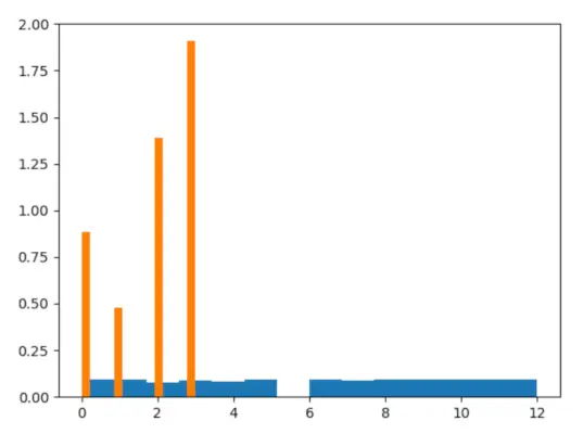 # import choice> import> numpy as np> import> matplotlib.pyplot as plt> > # Using choice() method> gfg>=> np.random.choice(>5>,>1000>, p>=>[>0.2>,>0.1>,>0.3>,>0.4>,>0>])> > count, bins, ignored>=> plt.hist(gfg,>14>, density>=> True>)> plt.show()> |