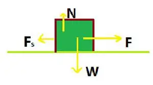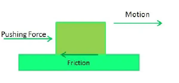 Laten we nu bedenken dat er een kracht P op het blok wordt uitgeoefend. Het is duidelijk dat het lichaam in rust blijft omdat een andere kracht F in horizontale richting een rol speelt en de uitgeoefende kracht P tegenwerkt, wat resulteert in een netto kracht nul op het lichaam. Deze kracht F die langs het oppervlak van het lichaam in contact komt met het oppervlak van de tafel, wordt wrijvingskracht genoemd.
